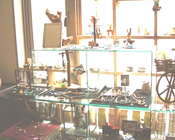 ギャラリーのとんぼ玉展示(やや逆光) しろがね屋の玉です