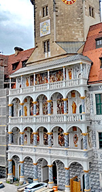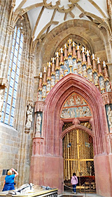 川の対岸から見上げたアルブレヒト城と大聖堂 マルクト広場の聖母教会 内部 裏側 市立博物館になっている教会とその前の泉