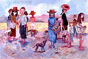 猪熊弦一郎 長江埠の子供達1941 藤田嗣治 アッツ島玉砕1943 女流美術家奉公隊 大東亜戦皇国婦女皆働之図春夏の部1944(部分) 浜田知明 初年兵哀歌(歩哨)1954