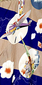 子供用や女性用の着物に、戦車・戦艦・戦闘機(陸海空軍セット)、爆弾、大砲などの絵柄が描かれたものが、昭和10年代には大流行したそうで。